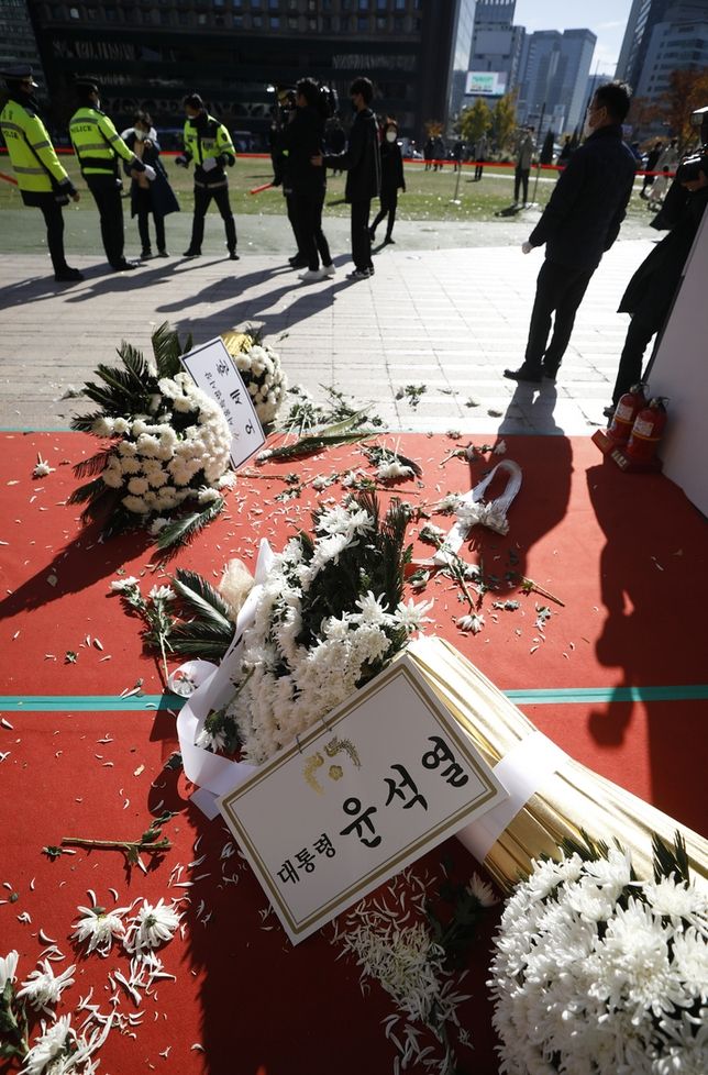 이날 서울 중구 서울광장에 마련된 이태원 사고 희생자 합동분향소를 찾은 시민들은 엄숙한 분위기에서 희생자들에 대한 추모를 이어갔으나, 바닥에는 윤 대통령과 오 시장의 이름이 적힌 조화가 쓰러진 채 어수선한 모습이었다.