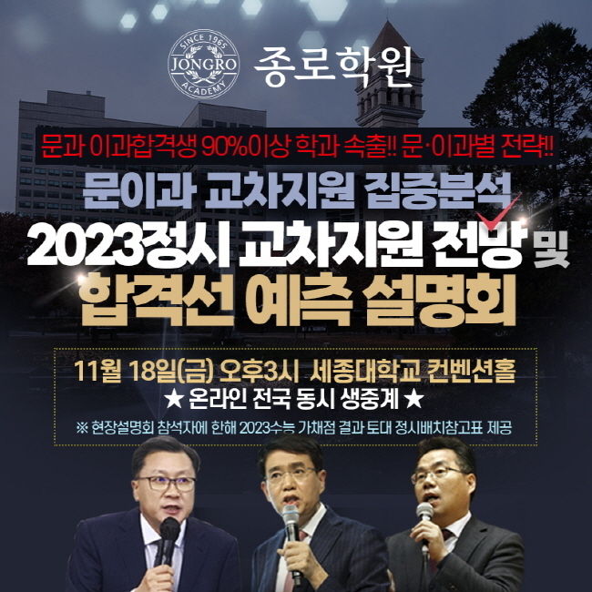 [시사뉴스 홍경의 기자] 2023학년도 대입수학능력시험이 오는 11월 17일 실시됨에 따라 종로학원에서는 수능 다음날인 18일 오후3시 세종대학교 컨벤션홀에서 “2023정시 교차지원 전망 및 합격선 예측 설명회”를 오프라인으로 실시하고 지방권 학생들을 위해 온라인으로 동시 생중계 할 예정이다.