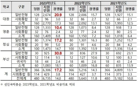 대원국제중은 15.7대 1에서 20.9대 1로, 청심국제중은 16.3대 1에서 17.2대 1로, 영훈국제중은 8.4대 1에서 10.4대 1로 올랐다. 4개 학교 모두 지난해보다 경쟁률이 크게 오른 것으로 집계됐다.