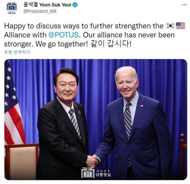 윤 대통령은 이날 트위터에 영어로 "바이든 대통령과 한미 동맹을 강화하기 위한 방안을 논의하게 돼 기쁘다"며 "우리의 동맹은 그 어느 때보다 강력하다"고 했다.