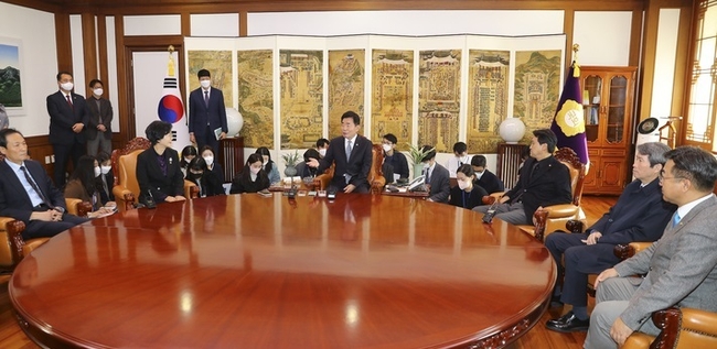 [시사뉴스 홍경의 기자] 더불어민주당 4선 이상 중진의원들이 17일 김진표 국회의장을 예방해 이태원 참사 국정조사의 신속한 실시를 촉구했다.