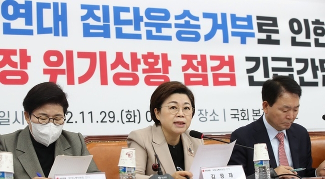 김미애 원내대변인은 이에 대해 "민노총은 3년 연장안을 걷어차고 거리로 나가 불법을 서슴지 않았고, 15일간 집단 운송거부로 인한 경제 피해만 3조5000억원"이라며 "화물연대의 횡포를 달래기 위해 정부와 국회가 협상하는 모양새 또한 불법을 용인하고 불의에 타협하는 나쁜 전례가 될 수 있다"고 했다.