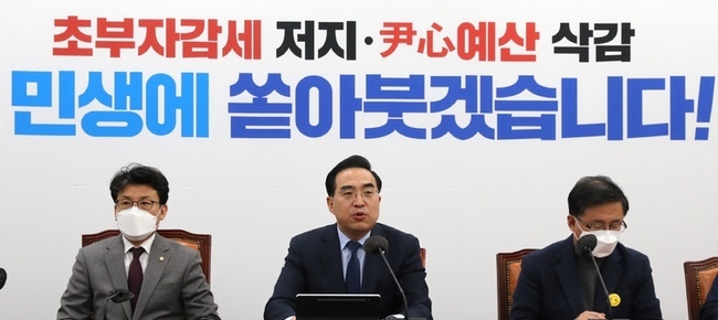 또 "윤석열 정부는 내년 예산안 심사 과정에서 슈퍼 부자 세금을 깎아 주지 못해 안달이었다"며 "반면 청년·노인 일자리, 소상공인을 위한 지역화폐, 서민 위한 민생 예산은 전액 삭감하거나 축소했다"고 했다.
