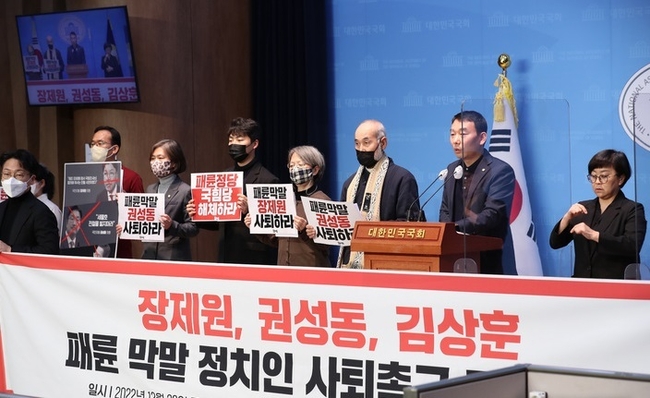 이들은 이날 오후 국회 소통관에서 시민단체 촛불행동과 '패륜 막말 정치인 사퇴촉구 기자회견'을 열어 국민의힘의 장제원·권성동·김상훈 의원의 이태원 참사 관련 발언들을 비판했다. 촛불행동은 매주 토요일 윤석열 정부 퇴진 촛불 대행진을 진행하는 시민단체다.