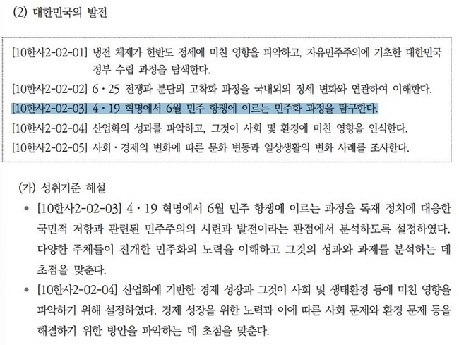 다만 "구체적인 역사적 사건명은 삭제됐으나 현행 교육과정과 마찬가지로 2022 개정 교육과정에서도 4·19 혁명에서 6월 민주항쟁에 이르는 민주화 운동의 과정을 학습할 수 있도록 관련 성취기준을 개발했다"고 덧붙였다.