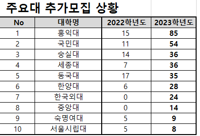 서울권 홍익대 85명(전년 15명), 국민대 54명(전년 11명), 숭실대 36명(전년 14명) 등 서울권 주요 대학도 추가모집을 실시하는 것으로 나타났다.
