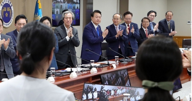 윤 대통령은 "기나긴 팬데믹을 지나 일상으로 오기까지 코로나 최전선에서 헌신해주신 의사, 간호사, 간호 조무사분들, 백신 치료제 연구개발에 노력해주신 보건산업종사자, 지자체 공무원, 보건당국에 감사드린다"고 말했다. 윤 대통령은 자리에서 일어나 이날 회의에 참석한 의료진들에게 박수를 보냈다.