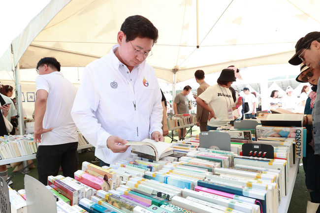 점심은 시장실에서 수행원들과 함께 컵라면으로 간단히 해결하고, 오후 1시쯤 시청 하늘광장으로 이동했다. 5년 만에 열린 ‘제5회 용인 북페스티벌’ 에 참석해 축사를 하고, 용인의 공공도서관과 작은 도서관, 지역 서점 등이 운영하는 체험 부스를 일일이 찾았다. 각 도서관에서 일정 기한이 지난 책들을 1천원에 판매하는 곳도 찾아서 진열대를 살펴 보고 책 두 권을 사기도 했는데, 이는 이 시장의 아이디어로 지난해 가을에도 수지도서관에서 시행한 바 있다. 이날 행사엔 시민 1만여 명이 참여했다.