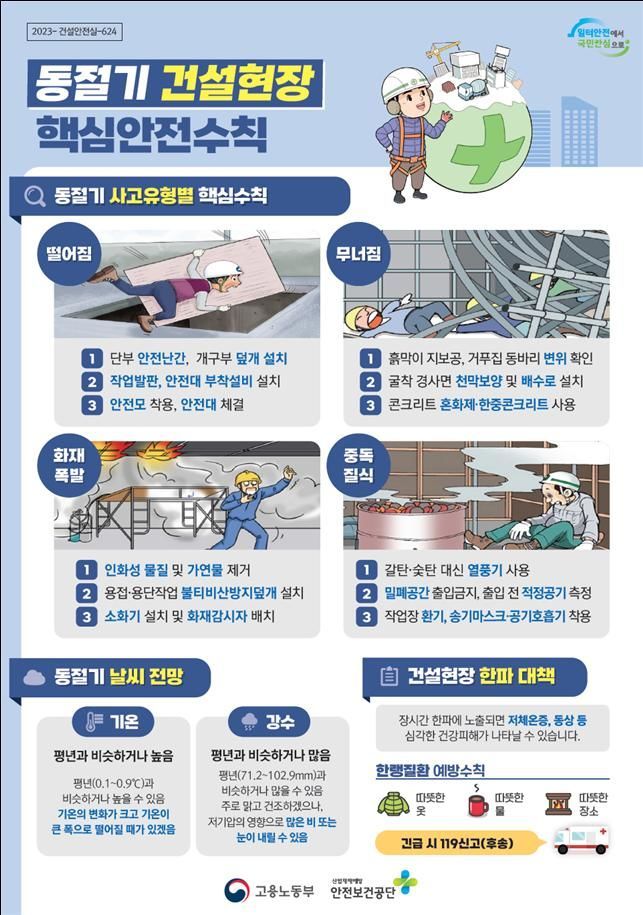 고용부와 안전보건공단은 겨울철 사고를 막기 위해 핵심안전수칙을 건설현장에 제공하고, ▲동절기 건설현장의 사고사례 ▲핵심안전수칙 ▲안전보건교육자료 ▲자율점검표 등을 담은 '동절기 건설현장 안전보건길잡이'를 인터넷에 게재할 예정이다.