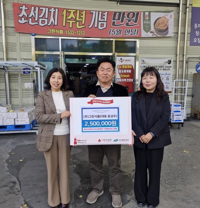 [시사뉴스 이성동 기자] ㈜그린식품(대표 윤상두)은 11월 17일(월), 대구 북구청(청장 배광식)에 BOOKIDS 도서구입비 사업에 참여한 아동 중 독후활동 우수참여자 25명에게 전달될 250만원 상당의 기프트카드를 기탁했다.