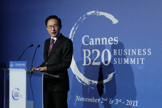 이 대통령은 이날 깐느 마르티네스 호텔에서 열린 B20(비즈니스 서밋 20) 만찬에서 기조연설을 통해 "과도한 복지지출과 방만한 재정운용으로 국가채무가 쌓인 국가들은 재정건전성을 회복하기 위한 뼈를 깎는 구조조정을 해야 한다"며 이 같이 말했다.