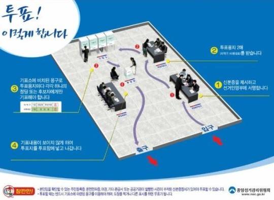 투표 당일 유권자는 투표소 입구 안쪽에 마련된 '본인 확인하는 곳'에서 신분증을 제시하고 선거인명부에 서명을 해야 한다.