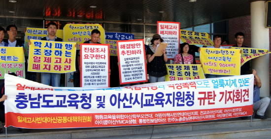 평등교육을위한 아산학부모연대와 민노총충남본부 아산시의원회 등으로 구성된 일제고사반대 아산지역공동대책위원회 10여명은 27일 오후 아산교육지원청 앞에서 학생체벌 방조하는 일제고사 폐지하라며 '충남도교육청·아산시 교육지원청 규탄 기자회견'을 열었다.