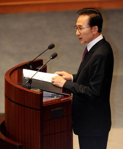 이 대통령은 이날 오후 여의도 국회의사당 본회의장에서 열린 제19대 국회 개원 기념 연설에서 “(글로벌 경제)위기 이후 다가올 국제 질서에 대비한 각오와 전략을 수립해야 할 때”라며 이같이 말했다.