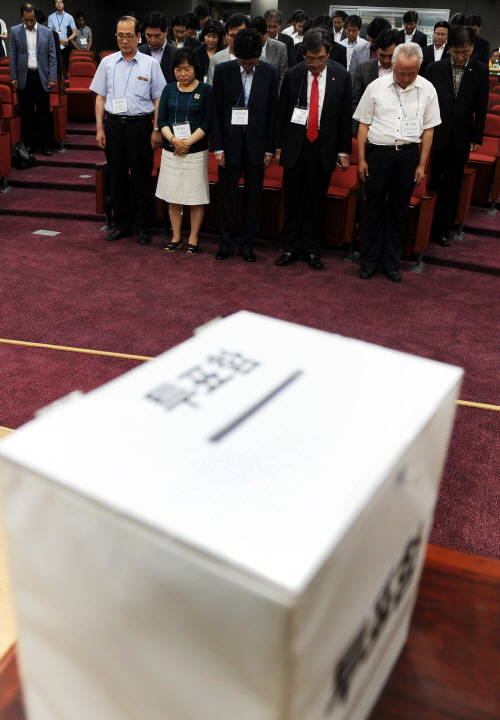 이날 1~3차 투표에서는 정세균·김두관·문재인 후보 순서로 탈락했다. 손학규 후보를 두고 찬반 여부를 묻는 4차 투표에서 손 후보는 3분의2 이상의 동의를 이끌어내지 못해 최종 후보로 낙점되지 못했다.