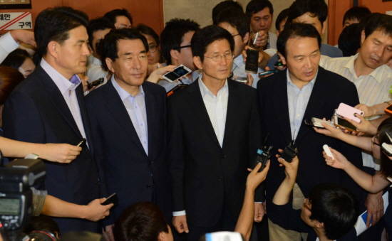 김문수·임태희·김태호·안상수 후보는 이날 오후 국회 정론관에서 기자회견을 갖고 "황우여 대표가 8월4일까지 책임지고 사퇴하지 않으면 중대한 결심을 할 것"이라고 밝혔다.