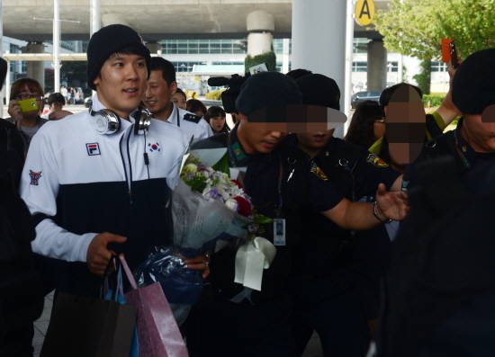 수백 명의 팬들과 취재진이 박태환을 보기 위해 공항을 찾았다. 런던올림픽 최고의 인기 스타다웠다. 입국장을 빼곡히 둘러싼 여성팬들이 환호성을 질렀다. 오후 4시께 박태환이 모습을 드러냈다.