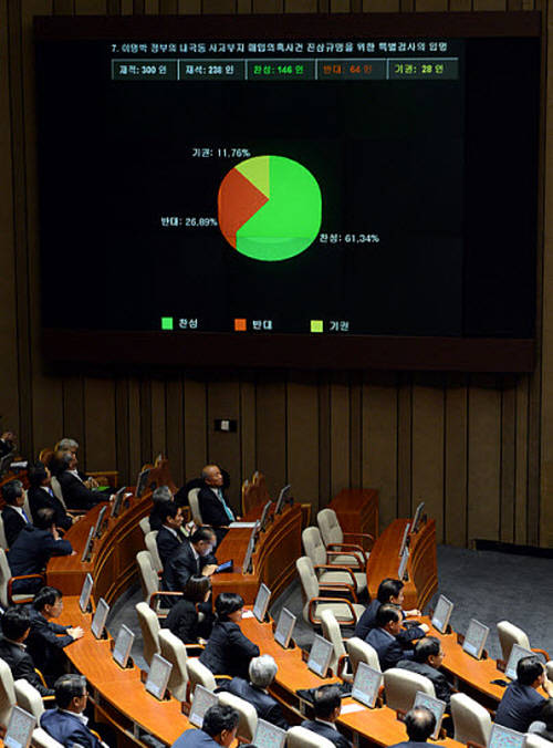 국회는 이날 오후 본회의를 열고 '이명박 대통령 내곡동 사저부지 매입의혹사건 진상규명을 위한 특별검사의 임명 등에 관한 법률안(내곡동 사저 특검법안)'을 재석의원 238명 중 찬성 146명, 반대 64명, 기권 28명으로 가결시켰다.