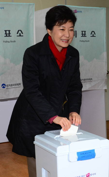 새누리당 박근혜 대선 후보는 19일 오전 8시15분께 삼성동 자택 근처에 위치한 언주중학교에서 투표를 마쳤다. 전날 늦은 시간까지 유세활동 펼친 박 후보는 예고된 시간보다 10여분 늦게 검은색 카니발 차량을 타고 집을 나섰다.