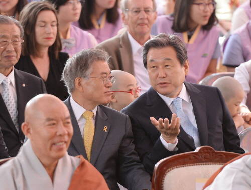 김 대표와 문 대표는 이날 오전 서울 종로구 조계사 대웅전에서 열린 봉축 법요식에 참석, 관례에 따라 옆 자리에 나란히 앉았다. 자연스레 두 대표의 만남이 이뤄졌는데, 서로 길게 대화하는 장면이 포착되기도 했다.
