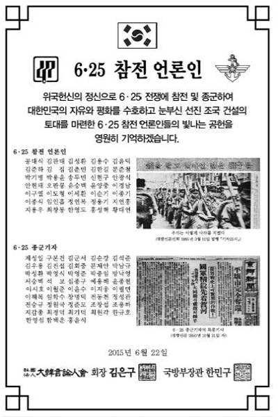 한민국 국방장관은 이날 오후 3시 국방부 신청사 브리핑실에서 6·25 참전 언론인 35명과 종군기자 43명 등 총 78명의 이름이 새겨져 명패를 헌액한다.