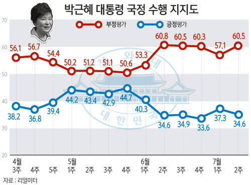 13일 여론조사기관인 리얼미터에 따르면 이달 2주차(6∼10일) 주간집계에서 박 대통령의 국정수행에 대한 긍정평가는 1주일 전에 비해 2.7%포인트 하락한 34.6%를 기록했다. 반면에 부정평가는 60.5%로 전 주에 비해 3.4%포인트 상승했다. 이로써 부정평가와 긍정평가 격차는 19.8%포인트에서 6.1%포인트 벌어진 25.9%포인트를 기록했으며 모른다고 답하거나 응답하지 않은 경우는 4.9%였다.