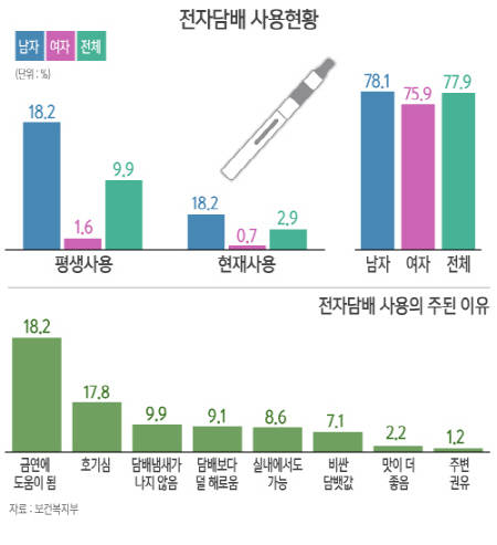특히 20대 남성 10명중 1명(12.4%) 이상이 현재 전자담배를 사용한다고 답했다. 2013년 건강영양조사에서는 1%였다. 최근 들어 젊은 층 사이에서 급속하게 번진 것을 알 수 있다.