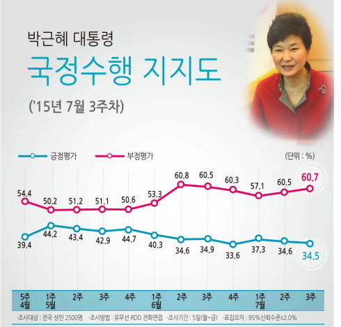 20일 여론조사기관 리얼미터의 7월 셋째 주 국정수행 지지도 주간조사 결과에 따르면 박 대통령의 취임 125주차 지지율은 한 주 전에 비해 0.1%포인트 하락한 34.5%를 기록했다.