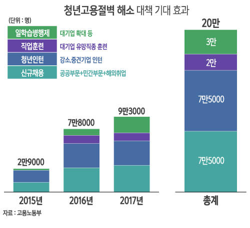 신규채용은 신규교원과 포괄간호서비스 확대 등 공공부문에서 4만여개, 청년고용 창출에 노력한 기업에 재정지원을 강화해 민간 및 해외취업에서 3만5000개다. '일 경험 기회' 12만5000명은 강소·중견기업에서의 청년인턴 7만5000명, 대기업 유망직종 직업훈련 2만명, 일학습병행제 3만명을 합한 것이다.