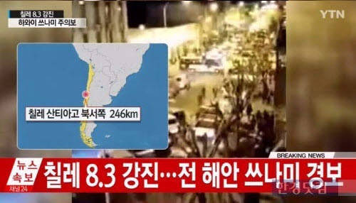 [시사뉴스 강철규 기자]16일(현지시간) 오후 7시54분 칠레 앞바다에서 발생한 규모 8.3 지진으로 지금까지 최소한 5명이 숨지고, 한 명이 실종됐으며 100만 명이 대피했다.