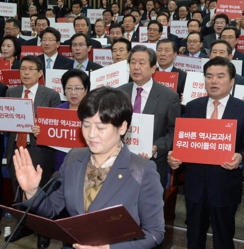 여당은 이날 의원총회를 열어 국정교과서와 야당의 본회의 복귀를 촉구하는 결의문을 채택했다.