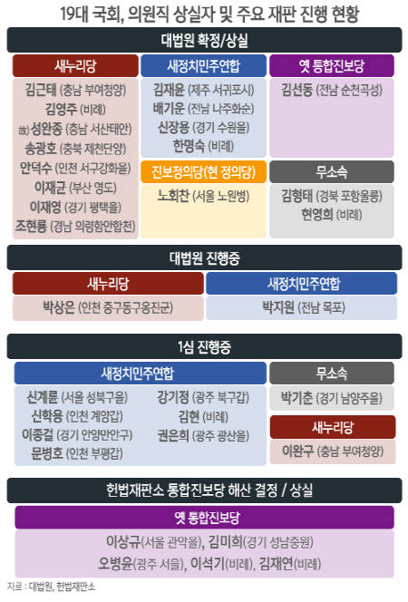 이들에 앞서 정치자금법 위반 혐의로 기소돼 징역 2년과 추징금 8억8000만원이 확정된 새정치연합 한명숙(71) 전 의원을 비롯해 고(故) 성완종·김근태(63)·김영주(61)·안덕수(69)·이재균(61)·이재영(59)·배기운(65)·신장용(52)·노회찬(59)·김선동(48)·김형태(63)·현영희(64) 전 의원 등 13명이 대법원에서 당선무효형이 확정됐다.