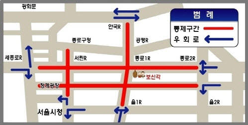 우선 종로(세종대로사거리~종로2가사거리), 청계천로(청계광장~청계2가사거리), 무교로(시청뒷길사거리~종로구청), 우정국로(광교~안국동사거리), 남대문로(을지로입구~광교) 등은 양방향 전차로가 통제된다.