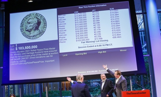 [시사뉴스 홍경의 기자] 우크라이나 난민 어린이들을 도울 기금 마련을 위해 지난해 노벨 평화상을 수상한 러시아 언론인 드미트리 무라토프가 경매에 내놓은 수상 메달이 20일(현지시간) 1억350만 달러(약 1335억원)라는 노벨상 메달 사상 최고 가격에 낙찰됐다.