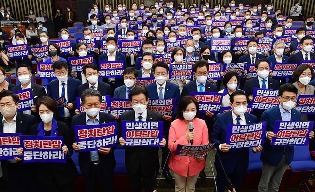 민주당은 의원들 명의 규탄 성명서도 냈다. 이들은 이 대표에 대한 검찰 출석 요구를 지적하면서 "그간 이 대표는 검찰의 무리한 수사에도 성실히 협조해 왔다"고 반발했다.