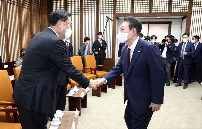 정 위원장은 윤 대통령과 사전환담 내용에 대해서는 "예산 문제에 대해 주로 얘기했다"고 말을 아꼈다. 그는 '윤 대통령이 사전환담에서 (보이콧) 유감을 표했느냐'는 질문에도 즉답을 피했다.