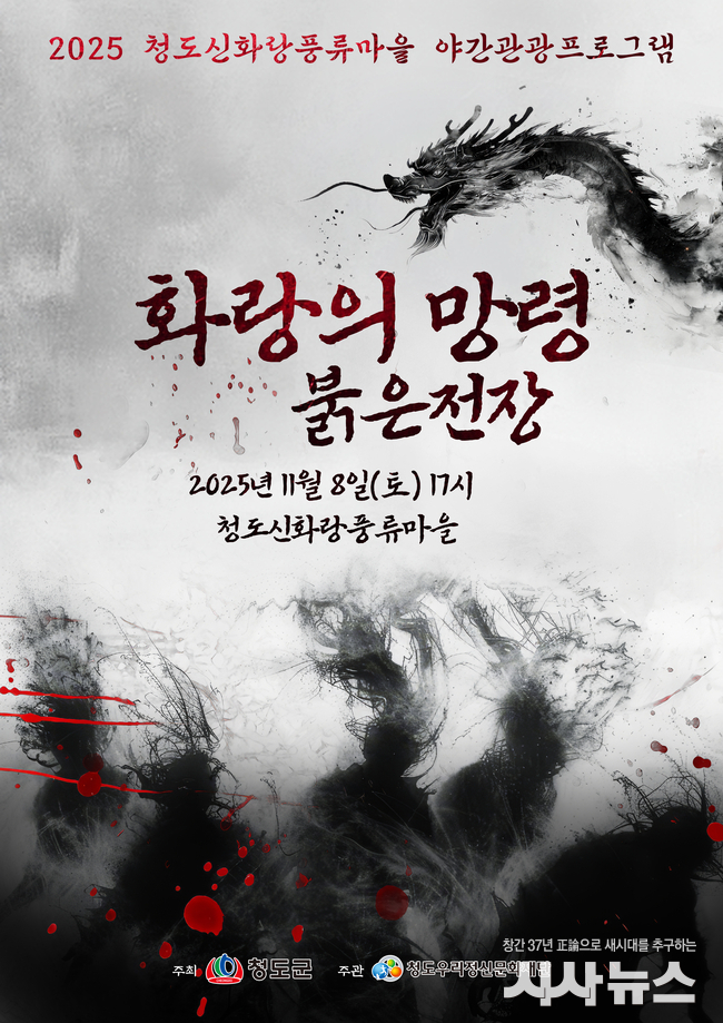 [시사뉴스 장시목 기자]청도우리정신문화재단(대표이사 기화서)은 오는 11월 8일(토) 오후 5시부터 밤 9시까지, 청도신화랑풍류마을에서 2025 야간관광 프로그램 「화랑의 망령: 붉은전장」 이색 공포체험 프로그램을 운영한다.