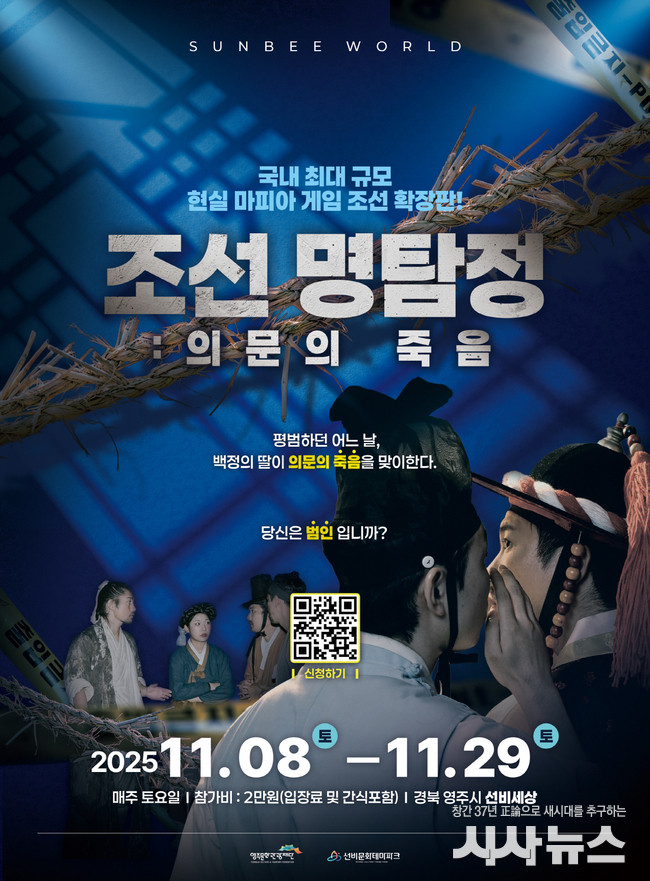 [시사뉴스 장시목 기자]영주시 선비세상에서 오는 11월 8일부터 매주 토요일, 참가자가 직접 조선시대 인물이 되어 연쇄 살인 사건의 진실을 밝혀야 하는 국내 최대 규모 체험형 마피아 게임 ‘조선명탐정: 의문의 죽음’이 개최된다.