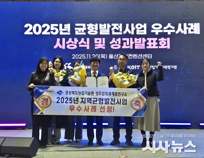 [시사뉴스 하정수 기자] 경상북도는 20일 대통령 직속 지방시대위원회가 주관한 ‘2025년 지역균형발전사업 우수사례 시상식’에서 경상북도농업기술원 성주과채류연구소가 지역농업연구기반 및 전략작목육성(R&D) 지원계정 부문 우수사례로 선정돼 우수 기관상을 받았다.