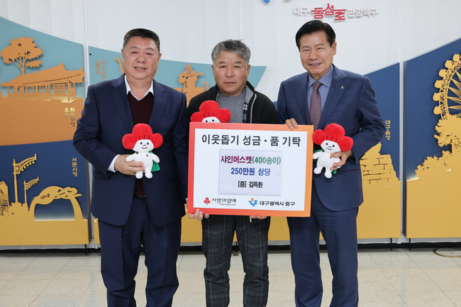 [시사뉴스 이성동 기자] 대구 중구(구청장 류규하)는 겨울철 취약계층을 돕기 위해 매년 나눔을 이어오고 있는 김득환 씨(중구자율방범연합대 직전대장)가 지난 24일 샤인 머스캣 400송이(250만 원 상당)를 기부했다고 밝혔다.
