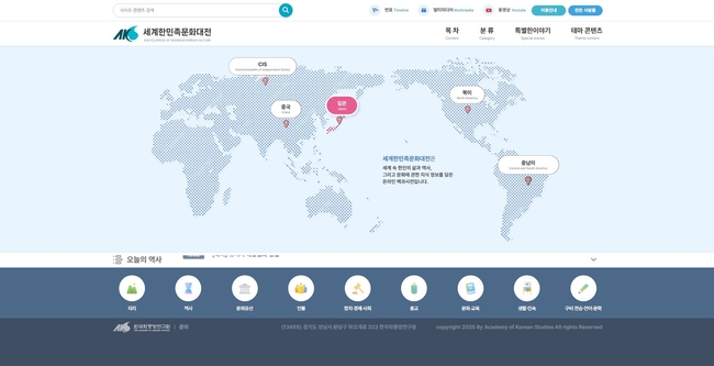 [시사뉴스 홍경의 기자] 한국학중앙연구원(원장 김낙년)은 기존 중국·일본·북미·CIS 권역으로 구축되어 온 온라인 백과사전 「세계한민족문화대전」)에 중남미 권역 콘텐츠를 신규로 구축하고, 서비스 영역을 확장해 12월 1일 공식 오픈한다고 밝혔다.
