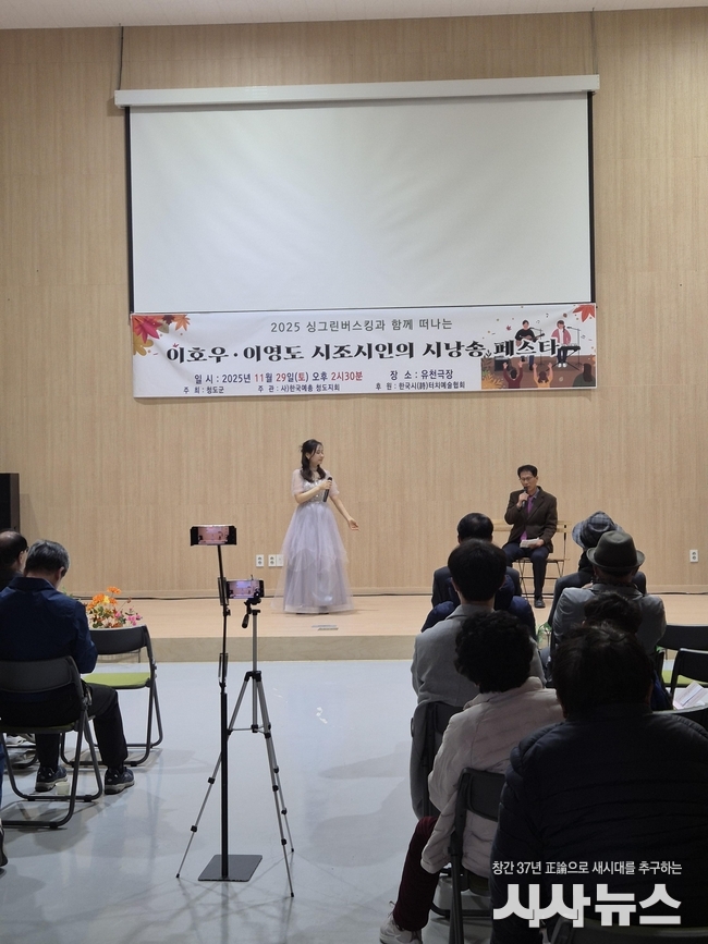[시사뉴스 장시목 기자]청도군(군수 김하수)은 지역 문화예술 활성화를 위해 마련한 ‘청도 싱그린 버스킹과 함께 하는 이호우·이영도 시낭송회’를 지난 2025년 11월 29일(토) 오후 2시 30분, 유천극장에서 개최했다. 유천극장은 이호우·이영도 시인의 생가 인근에 자리한 지역 대표 문화공연장으로, 다양한 생활문화 프로그램이 열리는 공연 공간이다.
