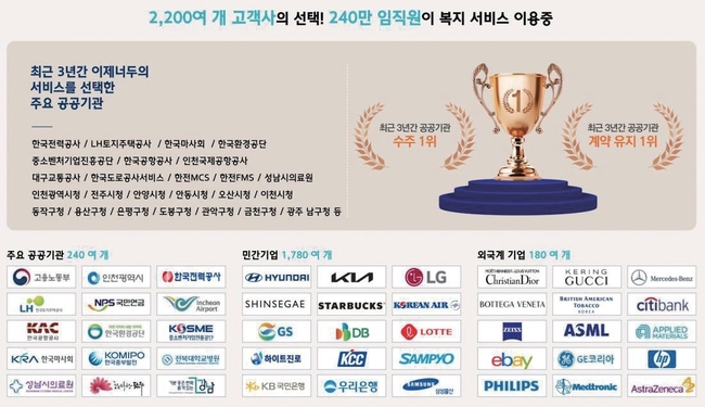 현재 2,700여 개 기업, 260만 이상 임직원이 저희 플랫폼을 통해 복지 포인트 사용, 휴양소, 법인콘도, 상조, 건강검진, 여가·레저, 여행·숙박 서비스를 편리하게 이용하고 있습니다.