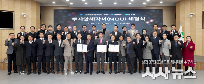 [시사뉴스 하정수 기자] 경상북도와 영주시는 15일 영주시청 강당에서 이철우 경상북도지사, 유정근 영주시장 권한대행, 임종득 국회의원, 박성만 경북도의회 의장, 김병기 영주시의회 의장, 정정모 ㈜코리아디펜스인더스트리 대표 등 20여 명이 참석한 가운데 ㈜코리아디펜스인더스트리와 경상북도·영주시 간 투자양해각서(MOU)를 체결했다.