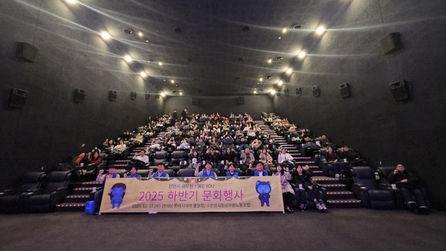 [시사뉴스 이용만 기자] 천안시청공무원노동조합(위원장 이영준)은 지난 12월 17일, 롯데시네마 천안불당점에서 조합원 300여 명이 참여한 가운데 ‘2025 영화관람 문화행사’를 성황리에 개최했다.