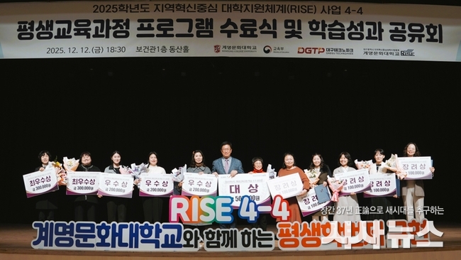 [시사뉴스 장시목 기자]계명문화대학교(총장 박승호)는 지역혁신중심 대학지원체계(RISE) 사업을 기반으로 추진해 온 평생학번제 구현 성과를 공유하기 위해 지난 12월 12일 보건관 동산홀에서 ‘2025학년도 평생교육과정 수료식 및 학습성과 공유회’를 개최했다.