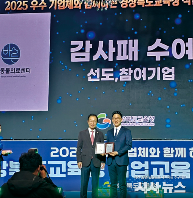 [시사뉴스 장시목 기자]대구24시바른동물의료센터(원장 이세원)가 경북지역 직업교육 발전과 현장실습 활성화에 기여한 공로를 인정받아 감사패를 수상했다.