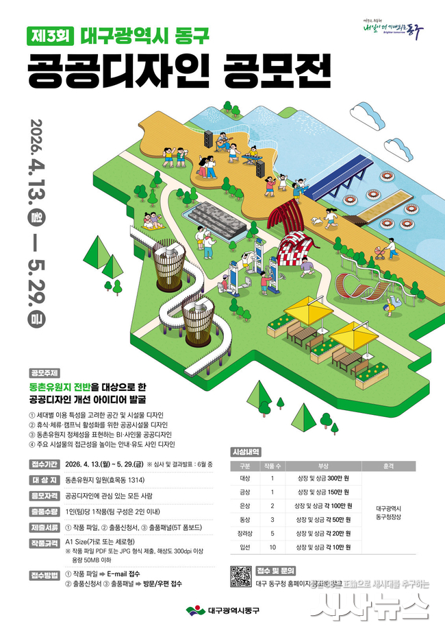 [시사뉴스 이성동 기자] 대구 동구청(구청장 윤석준)은 동촌유원지 일원의 공공디자인 수준을 종합적으로 개선하고 창의적인 디자인 아이디어를 발굴하기 위해 ‘제3회 대구광역시 동구 공공디자인 공모전’을 개최한다.