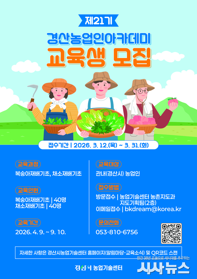 [시사뉴스 장시목 기자]경산시(시장 조현일)는 제21기 경산 농업인 아카데미(복숭아 재배 기초, 채소 재배 기초) 교육생(과정별 40명)을 31일까지 모집한다.