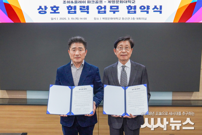 [시사뉴스 장시목 기자]계명문화대학교(총장 박승호)는 지난 19일 동산관(본관) 2층 대회의실에서 조이&플레이 파크골프와 파크골프 산업 발전 및 활성화, 관련 분야 전문인력 양성을 위한 업무협약을 체결했다.